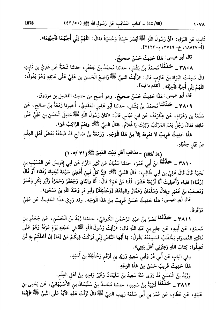 Джами ас-сахих (Сунан Ат-Тирмизи), книга: Достоинств. Глава: Достоинства Ахлул Байт Пророка (с), том 5, стр. 663, хадис 3788, изд-во Мустафа Аль-Баби Аль-Халаби, исследование Ахмад Мухаммад Шакир и другие, Египет, в пяти томах, издание второе, 1395 г.л.х. - 1975 г.