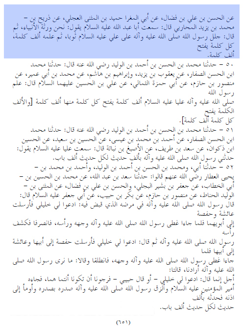 حدثنا أبي، ومحمد بن الحسن، وأحمد بن محمد بن يحيى العطار رضي الله عنهم قالوا: حدثنا سعد بن عبد الله، عن أحمد بن محمد بن عيسى، وإبراهيم بن هاشم، عن الحسن بن علي بن فضال، عن أبي المغرا حميد بن المثنى العجلي، عن ذريح بن – محمد بن يزيد المحاربي قال: سمعت أبا عبد الله عليه السلام يقول: نحن ورثة الأنبياء، ثم قال: جلل رسول الله صلى الله عليه وآله على علي عليه السلام ثوبا، ثم علمه ألف كلمة، كل كلمة يفتح ألف كلمة