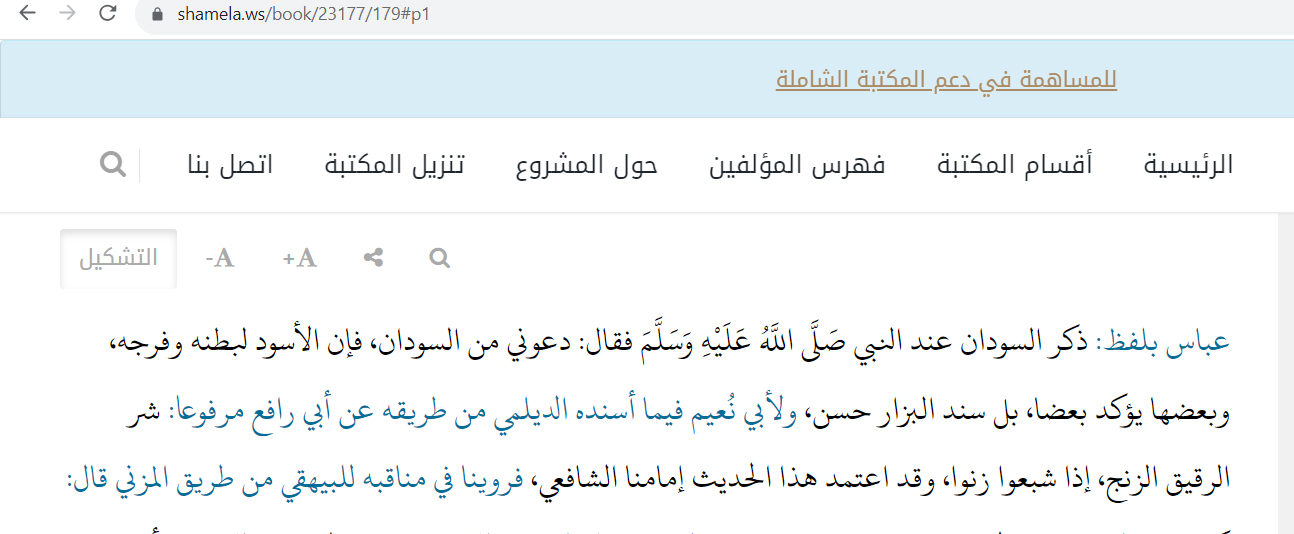 Табарани привёл в «Кабире» от Умм Айман: «Я слышала, как Посланник Аллаха (С) сказал: «Черный (негр) предназначен только для желудка и полового сношения». Также этот хадис приведён из хадиса Яхьи ибн Аби Сулеймана от Ата от Ибн Аббаса в таком виде: «Возле Пророка (С) были упомянуты черные (негры). Он сказал: «Не упоминайте возле меня негров! Ибо чёрный предназначен только для желудка и полового сношения!».
