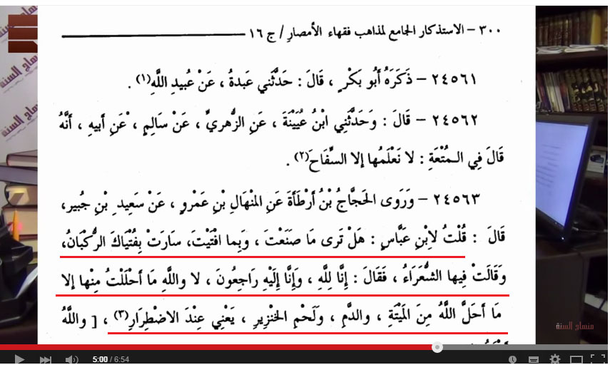 А что касается Саида ибн Джубейра, то именно он и передал запрет от своего шейха Ибн Аббаса. Посмотрим «Истизкар» Ибн Абдильбарра. Передано от Саида ибн Джубейра: «Я спросил у Ибн Аббаса: “Видишь ли ты, что ты сделал, и к чему привели твои фетвы...”»... И так далее... То есть Ибн Аббас сравнил мута со свиньёй и мертвечиной! Это кто передал? Саид ибн Джубейр! Поэтому на него в этом вопросе тоже ссылаться не надо.
