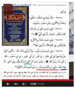 Но так-то просто наш ваххабит не сдаётся и продолжает заниматься тадлисом. Он приводит хадис из книги Ибн Абдульбирра, опять-таки в своей манере обрезая его. Полный хадис звучит так: «Посланник Аллаха (С) разрешил нам, и мы заключали никях с женщиной на определённый срок за кусок одежды (в виде платы). Но потом он запретил нам это – то есть в день Хейбара».