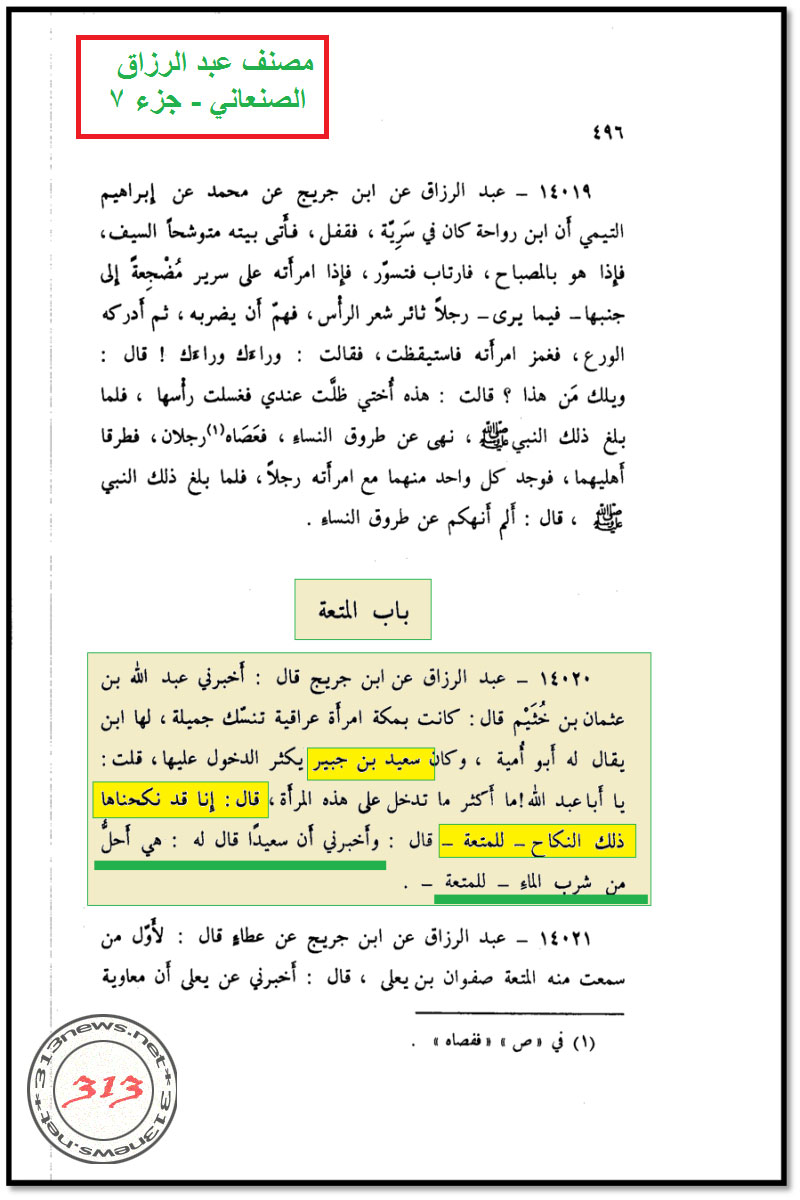 «В Мекке была красивая женщина из Ирака, у которой был сын, и его звали Абу Умейя. И Саид ибн Джубейр имел с ней много половых отношений. У него спросили: “Почему ты так много совокупляешься с ней?” И он сказал: “Я заключил с ней этот никях, то есть муту”. И Саид сказал: “Через муту она стала более дозволенной для меня, чем питьё воды”».